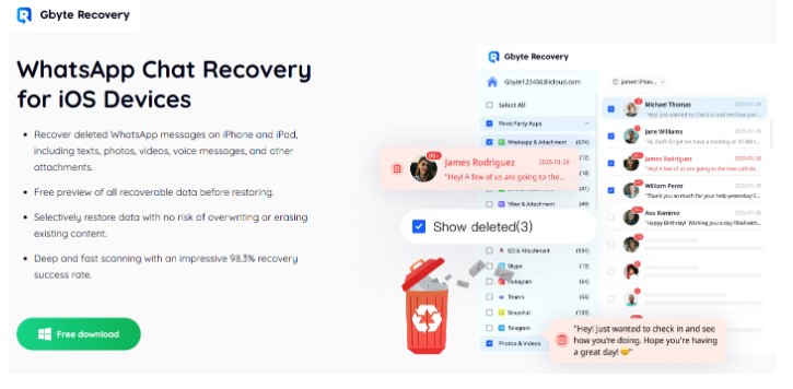 Gbyte Recovery stands out as the best data recovery software for WhatsApp for various reasons. Its comprehensive data recovery ability enables it to delve deep into your iOS system to retrieve what other tools can’t. You don’t need backup as it can retrieve your WhatsApp messages in any scenario. From system crashes or water damage, the tool will retrieve your chats with little effort. Furthermore, the software lets you scan and preview your conversations for free. Not only does this give you a hint of the amount of retrievable data, but it also allows you to only retrieve what you need.