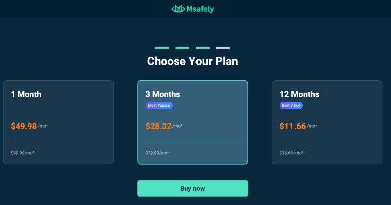 Msafely has three subscription plans. The one-month plan costs $28.98. The 3-month plan is the most popular and costs $28.32 per month. The best value is in its 12-month plan, which is available for $11.66 per month.