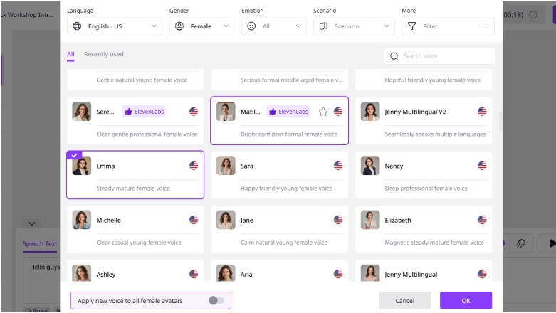 - 1830+ AI voices powered by ElevenLabs, Microsoft, and Google – with support for multiple languages and tones.